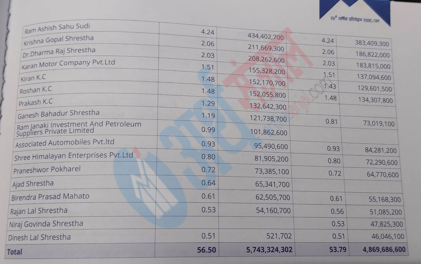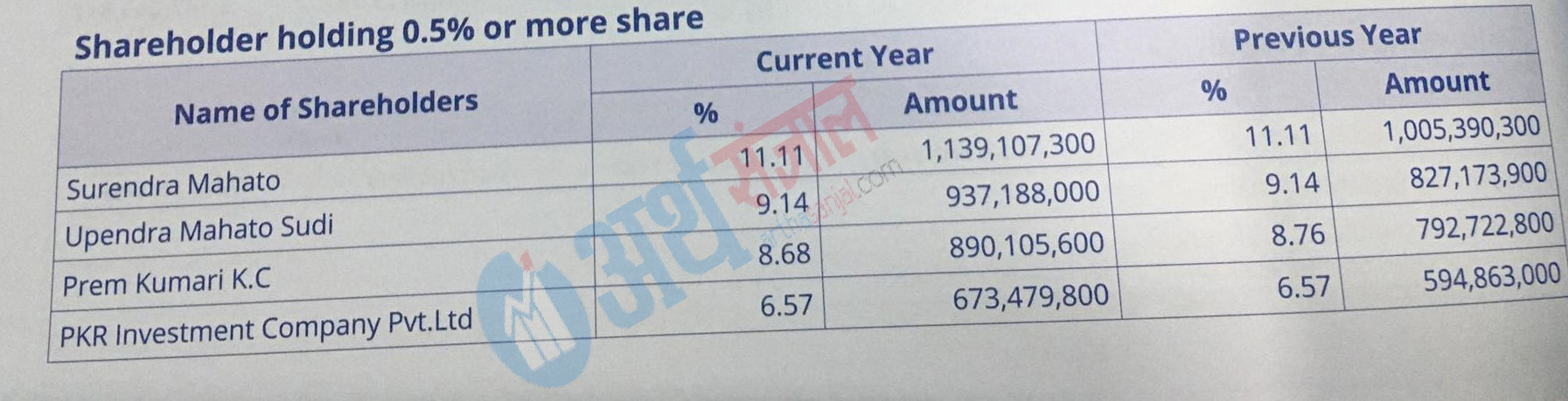 त्यसैगरी, दोस्रोमा उपेन्द्र महतोको ९.१४ प्रतिशत अर्थात् ९३ करोड ७१ लाख ८८ सेयर स्वामित्व रहेको छ ।