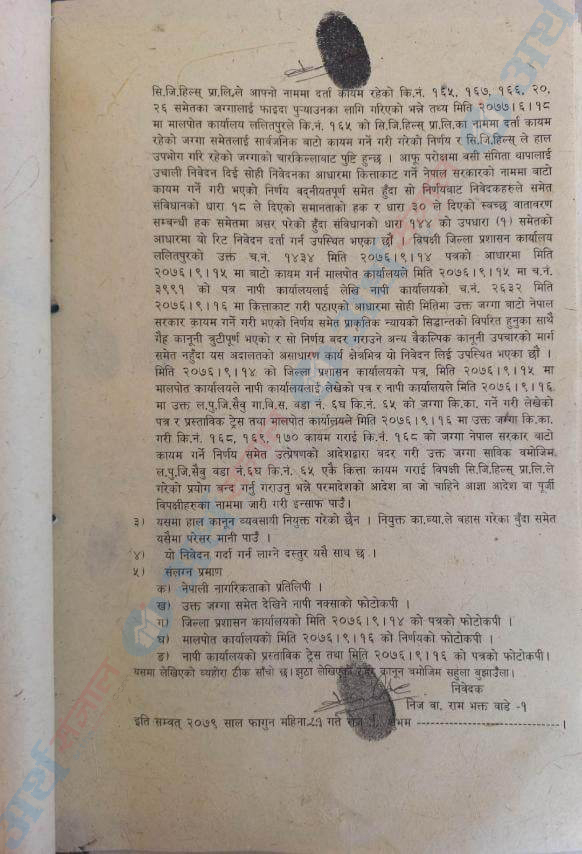 ललितपुर महानगरपालिका वडा नम्बर १८ बस्ने सामाजिक अभियान्ता तारा बराल, वडा नम्बर १८ बस्ने सुरेश थापा, परमेश्वर थापालगायतले चौधरीको सिजी हिल्स प्रालि र संगिता थापालाई विपक्षी बनाएर उच्च अदालत पाटनमा रिट दायर गरेका छन ।