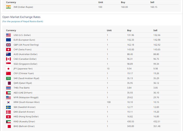 आज अमेरिकी डलर एकको खरिद दर १३१ रूपैयाँ ९६ पैसा र बिक्री दर १३२ रूपैयाँ ५६ पैसा तथा युरो एकको खरिद दर १४२ रूपैयाँ ३३ पैसा र बिक्री दर १४२ रूपैयाँ ९८ पैसा रहेको छ ।