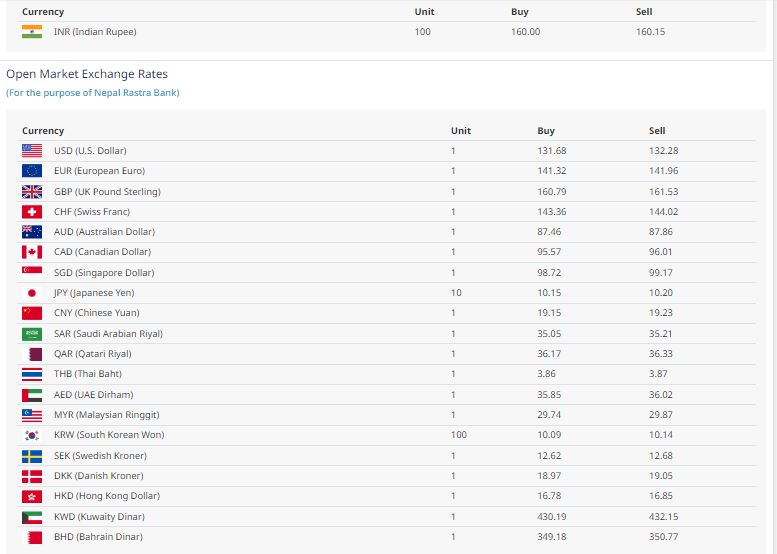 त्यस्तै बेलायती पाउण्ड एकको खरिद दर १६० रूपैयाँ ७९पैसा र बिक्री दर १६१ रूपैयाँ ५३ पैसा, स्वीस फ्र्याँक एकको नेपाली खरिद दर १४३ रुपैयाँ ३६ पैसा र बिक्री दर १४४ रुपैयाँ २ पैसा, अष्ट्रेलियन डलर एकको नेपाली खरिद दर ८७ रुपैयाँ ४६ पैसा र बिक्री दर ८७ रुपैयाँ ८६ पैसा रहेको छ ।