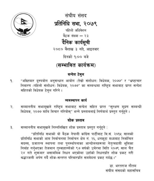 संघीय संसद सचिवालयले सार्वजनिक गरेको कार्यसूचीअनुसार बैठकमा तीनवटा विधेयक पेस गरिने र एउटा शोक प्रस्ताव पारित गरिनेछ ।