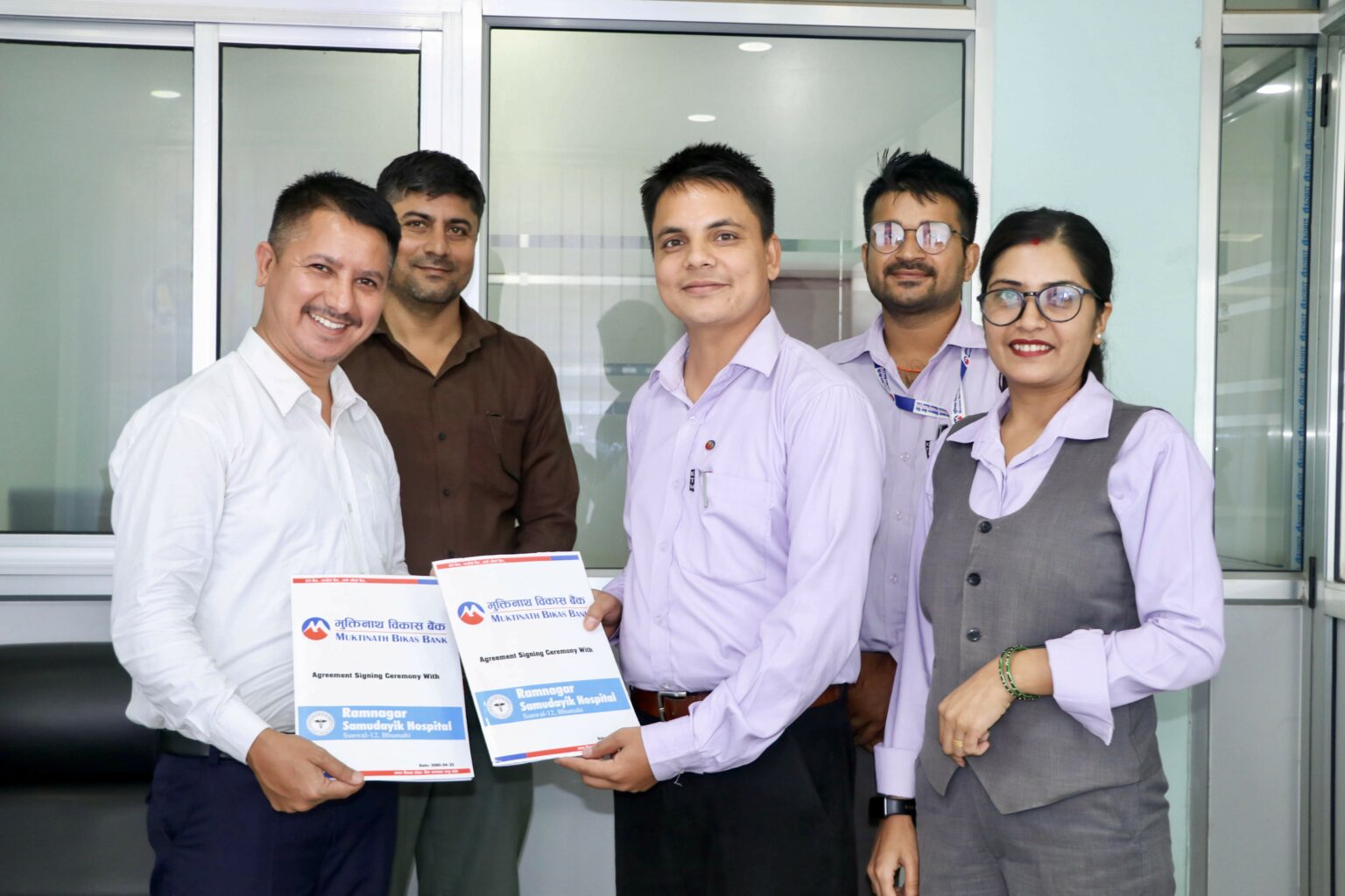 काठमाडौं । मुक्तिनाथ विकास बैंक र नवलपरासीको भुमहीमा रहेको “रामनगर समुदायिक हस्पिटलबीच सम्झौता समपन्न भएको छ । बैंकले आफ्ना भिषा डेविट कार्डवाहक तथा मोबाइल बैंकिङ्ग ग्राहकहरुलाई थप सेवा दिन हस्पिटलसँग छुट प्रदान गर्ने गरी व्यवसायिक सम्झौता गरेको हो ।