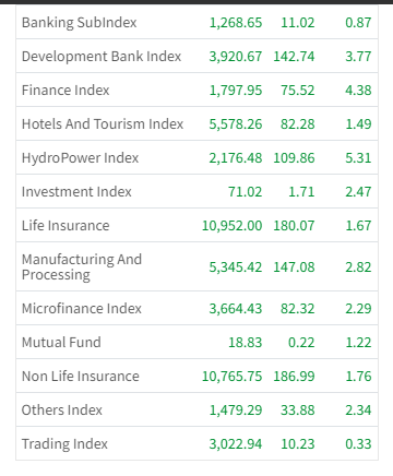 यस दिन १३ उपसूचकमध्ये अन्य सबै सूचकमा हरियाली छाएको छ । कारोबार भएका मध्ये २१७ कम्पनीको सेयर मूल्य बढेको छ भने ११ कम्पनीको सेयर मूल्य घटेको छ ।