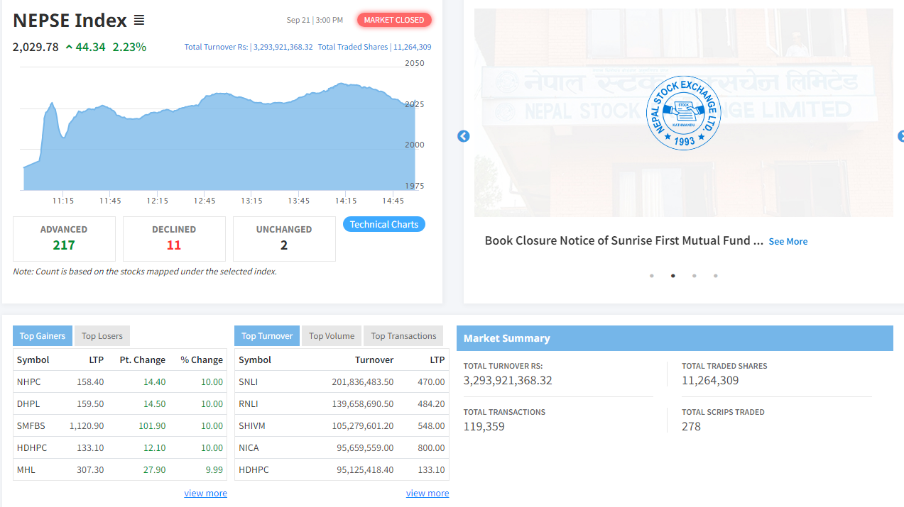 यस दिन सेयर बजार मापक नेप्से परिसूचक ४४.३४ अंकले बढेर २०२९.७८ को बिन्दुमा रोकिएको छ । सेन्सेटिभ परिसूचक पनि ७.५५ अंकले बढेर ३८८.७२ बिन्दुमा उक्लिएको छ ।